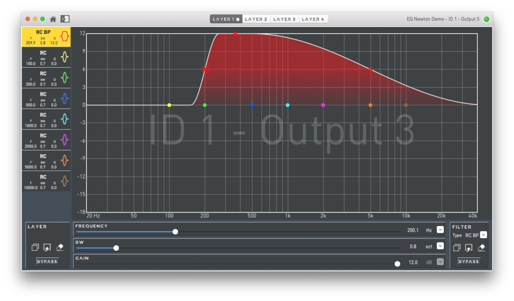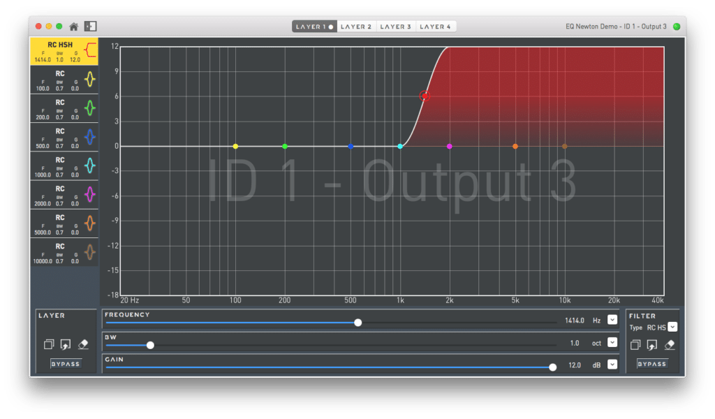 Diese spezielle Raised Cosine Filterbank steht im Newton-Processor für jeden DSP-Kanal zur Verfügung. In der Software gibt es dazu, ähnlich wie auch bei Powersoft oder Lake, mehrere Layer, die alle den kompletten Funktionsumfang enthalten und je nach Anwendung aufgeteilt werden können. Intern werden alle Layer dann zu einem Filter zusammengefasst und bearbeitet.