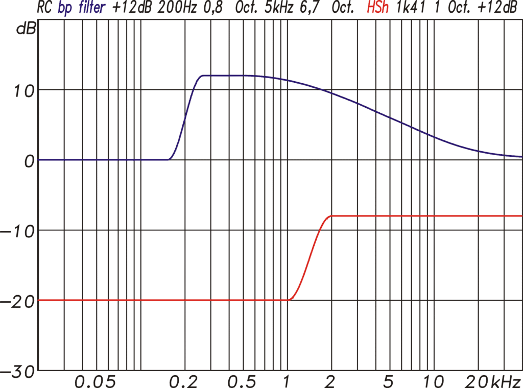 Bandpassfilter mit asymmetrischem Verlauf (gemessen in Abb. 26, blau), die Frequenzen der Flanken liegen bei 200 Hz und bei 5 kHz (Abb. 25) (Bild: Anselm Goertz)