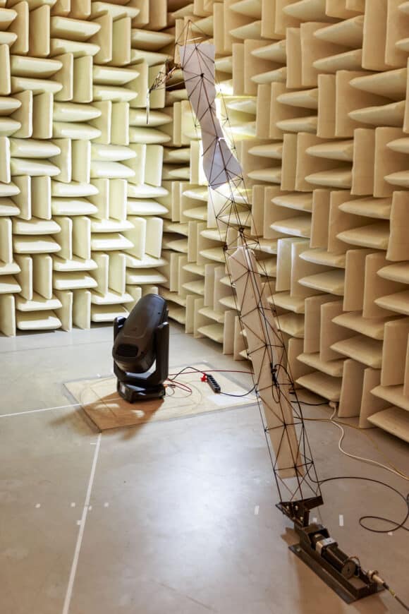 Im reflexionsarmen Raum des Akustiklabors IFAA in Herzogenrath steht das Movinglight auf einem Drehteller, der in 45 -Schritten gedreht wird. Der motorisch betriebene Mikrofonausleger neigt sich in 30 -Winkelschritten zur Seite. So werden hintereinander alle benötigten Messpunkte entlang der Hülle angefahren (Bild: Herbert Bernstädt)