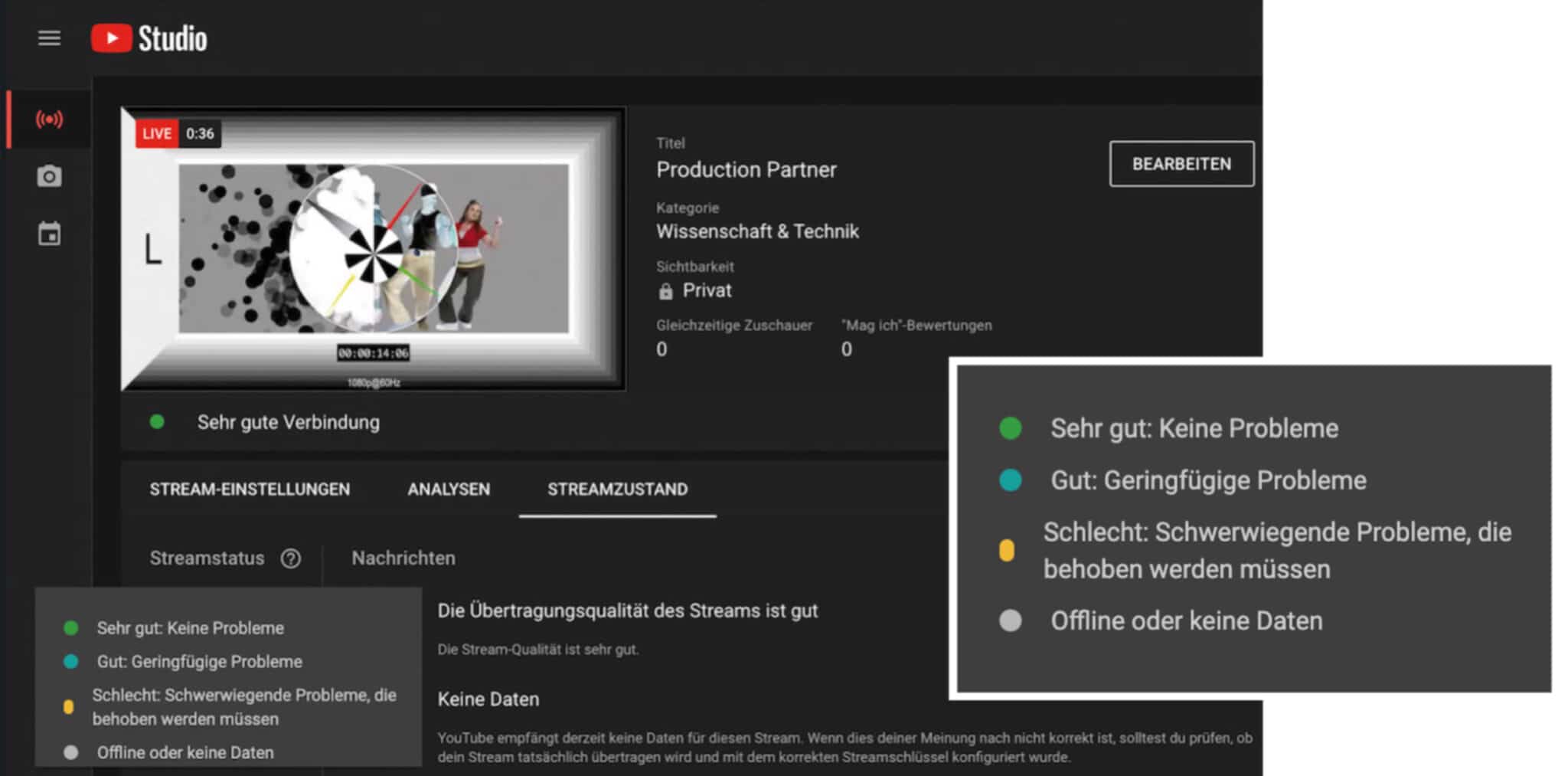Consumer-freundlich: Im Gegensatz zu Wowza liefert YouTube abstraktes Feedback, welches aber nur beruhigend ist, solange alles im grünen Bereich bleibt (Bild: Alexander Heber)