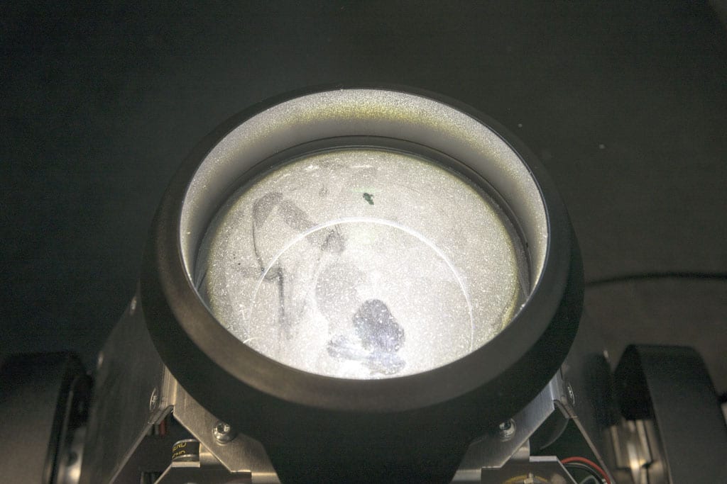Bis das Licht des Leuchtmittels aus dem Moving Head austritt, muss es u. a. diverse Linsen und Farbfilter passieren. Im laufenden Betrieb lässt es sich nicht vermeiden, dass sich mit der Zeit Staub und Reste von Nebelfluiden auf den Glasoberflächen dieser Komponenten niederlassen. Es kann passieren, dass sich in der Lichtprojektion schwarze Flecken, hervorgerufen durch z. B. Staub, erkennen lassen. Weiterhin ist es möglich, dass der Lichtstrom eingeschränkt wird und somit die Helligkeit abnimmt.