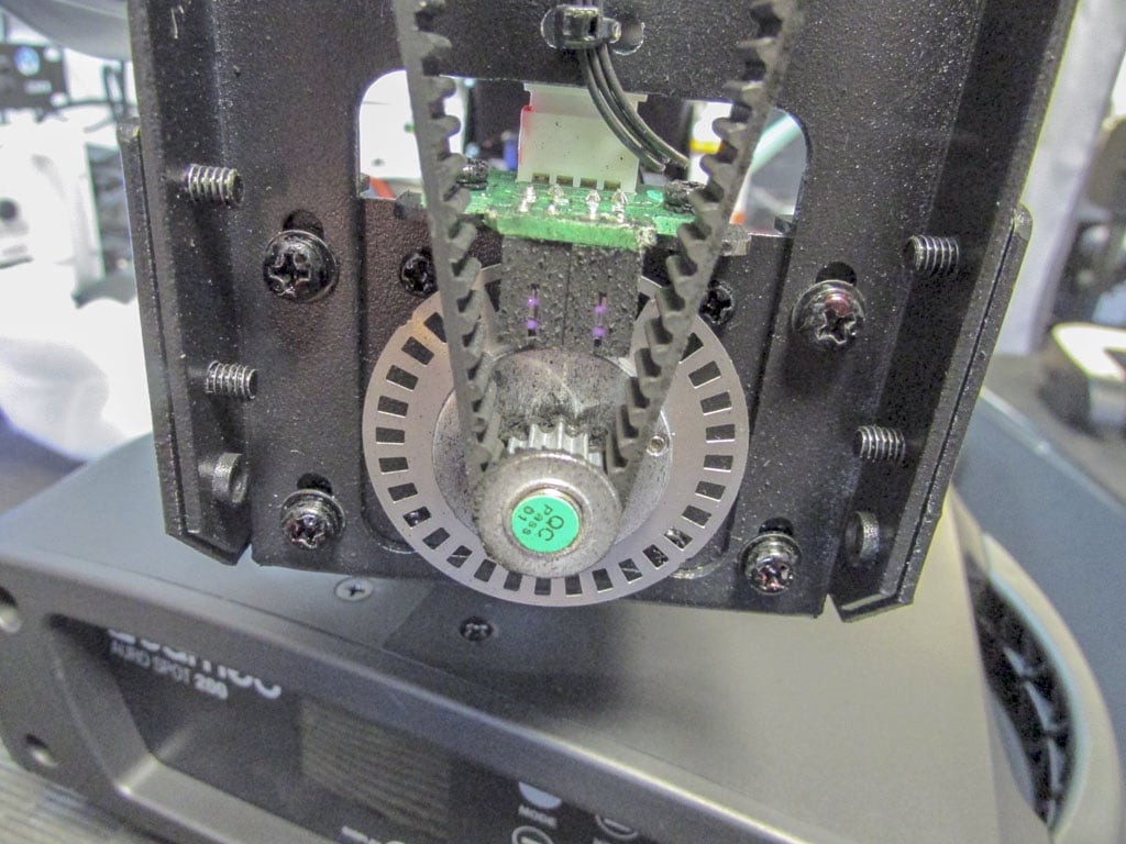 Bei Pan- und Tilt-Bewegungen ist das Moving Light teilweise hohen Belastungen ausgesetzt. Durch die entstehende Reibung zwischen Riemen und Ritzel, nutzt sich dieser mit der Zeit ab. Anfänglich kann sich das durch Quietschen oder Knarzen bei einer Bewegungsfahrt zeigen. Meistens entsteht dabei ein feiner schwarzer Staub, welcher sich in die Öffnung der sogenannten Reflexkoppler (Lichtschranke) absetzten kann. Im schlimmsten Fall ist dann eine Positionsbestimmung für Pan/Tilt nicht mehr möglich, da die Sensorik „blind“ ist.