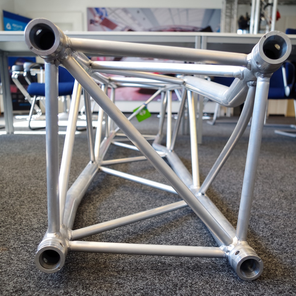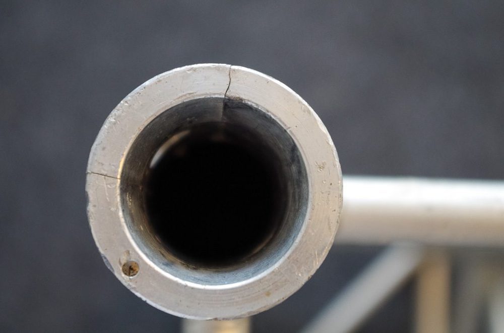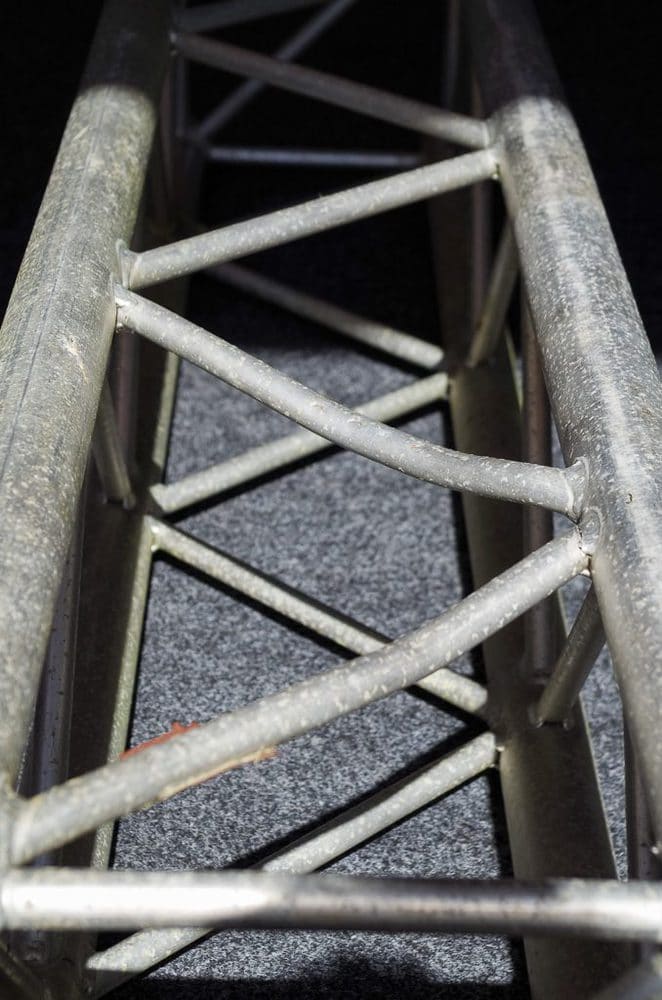 Stellt man leichte Grate fest, sollten diese mit feinem Schleifpapier entfernt werden, um Verletzungen zu verhindern. Eine allgemeine Reinigung kann durch Wasser oder lauwarme leichte Seifenlauge erfolgen. Bei Umwelteinflüssen besonderer Art wie zum Beispiel Salzwasser oder Seeluft in Meeresnähe sollte man die Reinigungsintervalle erhöhen. Aggressive Reiniger sind zu vermeiden, da es im Zweifel keine Erkenntnisse gibt, wie sich diese auf die Materialfestigkeit auswirken können. Auf keinen Fall sollten Fette und Öle eingesetzt werden, um die Passung zu erleichtern; dosierter Einsatz von Teflon- Spray kann als geeignet eingestuft werden. Hierzu ist grundsätzlich der Hersteller zu befragen. Zur Pflege (und, wie wir später sehen werden, zur regelmäßigen Prüfung) gehört auch das Entfernen von Endverbindern, um die Kontaktstellen zu reinigen. Im normalen Gebrauch exotisch, aber auch schon vorgekommen: Wasseransammlungen innerhalb des unteren Bereichs eines Gurtrohrs einer im Außenbereich stehenden Traverse. Durch Frost fror das Wasser zu Eis, dehnte sich aus und das Gurtrohr platzte auf. Durch regelmäßige Überprüfung und Entfernung der Verbinder wäre dieser möglicherweise gefährliche Schaden vielleicht vermeidbar gewesen.