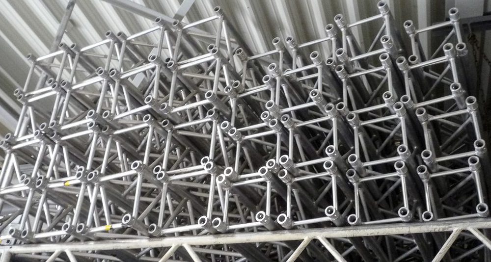 Der Transport von Traversen sollte so erfolgen, dass diese nicht beschädigt werden. Abgesehen vom Vorgang des Ladens und Entladens als Einzelteile (Gefahr der plastischen Verformung) wird häufig der Einfluss von mechanischer Belastung während des Transportes unterschätzt. Im Lkw – und auch anderen Transportmitteln – wird die ungeschützte Ladung möglicherweise einer den Transport über andauernden Bewegung ausgesetzt, die zu Verformung oder auch zum Materialverlust durch Abrieb führen kann. Die beste Transportmöglichkeit ist sicherlich die Nutzung von Traversen – wagen, auf denen die einzelnen Teile mit Abstandshaltern gegeneinander geschützt transportiert werden. Auch das Schieben und Ziehen einzelner Aluminiumträger über einen möglicherweise rauen Boden kann zu Abrieb führen. Klassiker bei größeren Baustellen sind sicherlich auch Beschädigungen durch den Einsatz von Gabelstaplern, mit denen versucht wird, die Gabel zwischen die Streben der Traversen zu stecken.