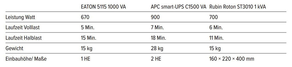 Beispielhafter Überblick über drei USV in einer Leistungsklasse, wie sie zum Beispiel am FOH gebraucht wird.