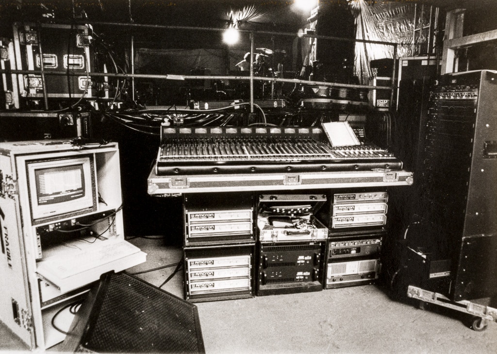 Gefüllte Racks waren 1994 Standard, und ganz vorne war man, wenn man (wie Günter Schwob 1994 am Midas-Monitorpult von Element of Crime) neben Crown-, Camco- und Carver-Amping sowie acht Yamaha-EQs noch einen MLSSA-Messplatz samt Röhrenmonitor und Drucker mitführte (Bild: Günter Schwob)