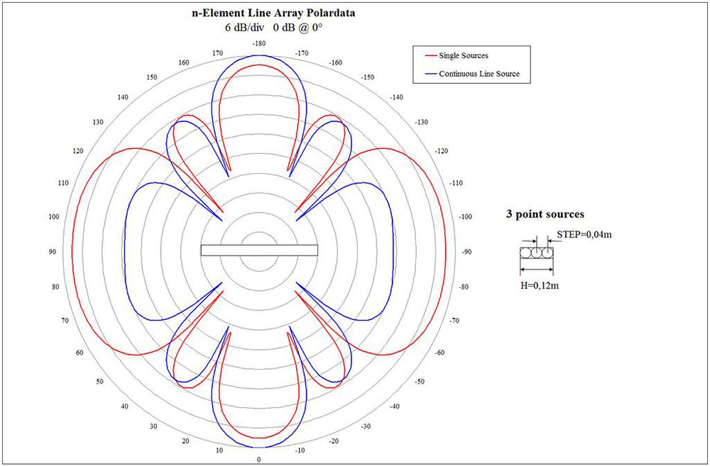 Baut man die Linienquelle aus Einzelquellen auf, die jede für sich betrachtet eine sphärische Wellenfront abstrahlen, dann funktioniert dieses Prinzip bis zu einer Frequenz, wo der Abstand der Einzelquellen einer halben Wellenlänge entspricht. Wird der Abstand größer als die halbe Wellenlänge, dann entstehen senkrecht zur Mittelachse zunächst Nebenmaxima mit zunehmender Tendenz, die dann im Extremfall bei einem Abstand von einer kompletten Wellenlänge oder mehr sogar neue Hauptmaxima ausbilden. Für einen Quellenabstand von 40 mm passiert Letzteres ab 8,5 kHz aufwärts. Die Polardiagramme in der Abbildung 1 zeigen den Vergleich von drei idealen Punktquellen (rot) mit jeweils 40 mm Abstand zueinander und einer gleich langen idealen Linienquelle (blau).