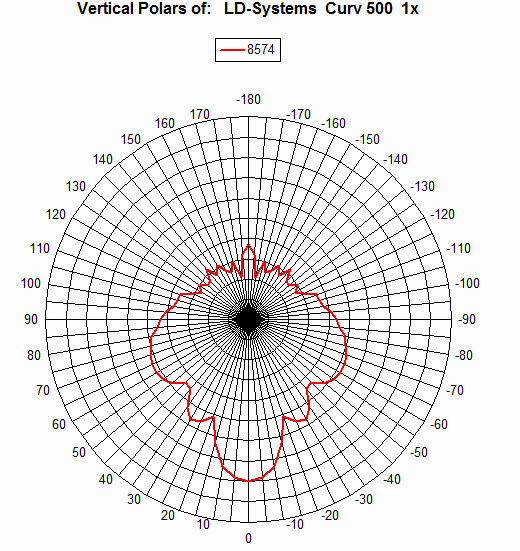 Polardiagramm der vertikalen Ebene eines CURV 500 Satelliten bei 8,5 kHz (Skalierung 6 dB/div). Die Nebenmaxima sind gegenüber der Anordnung aus idealen Punktquellen stark geschwächt, im hinteren Bereich kommt auch noch die abschirmende Wirkung des Gehäuses hinzu. (Bild: Anselm Goertz )