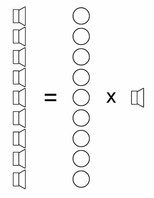 Array aus Einzellautsprecher (links) als Überlagerung einer vergleichbaren Punktquellenanordnung (Mitte) mit dem Abstrahlverhalten eines einzelnen Lautsprechers (rechts) (Bild: Anselm Goertz)