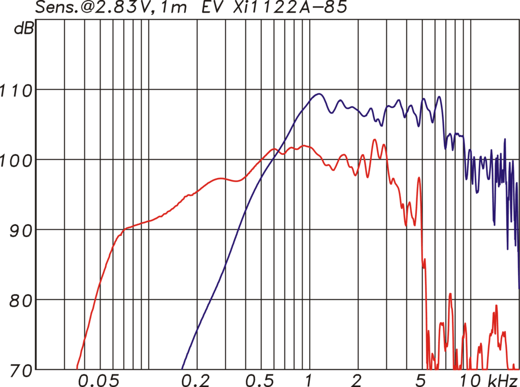 Wir betrachten dazu eine 12/2-PA-Box für den voll aktiven Betrieb. Abb. 18 zeigt dazu die Frequenzgangmessungen von Hoch- und Tieftöner. Die Messungen erfolgten in 4 m Abstand auf der Mittelachse zwischen Hoch- und Tieftöner im reflexionsarmen Raum. Unterhalb von 100 Hz wurde für den Tieftöner eine Nahfeldmessung ergänzt. Die Trennung der beiden Wege soll bei 1300 Hz erfolgen.