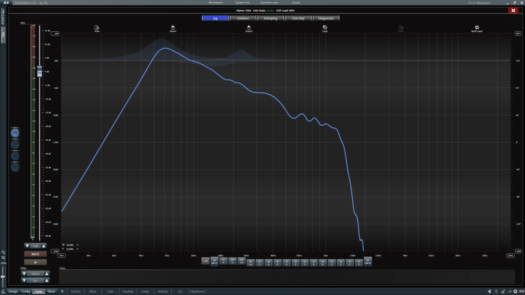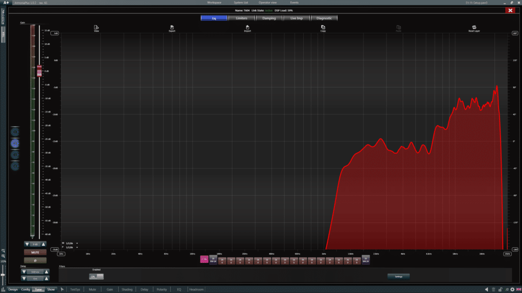 Berechnet haben wir die Filter nun mit dem Four Audio System Designer als externem Filter Tool (da die Powersoft- Armonía-Software aktuell noch kein eigenes Tool zur Berechnung der Custom-FIR-Filter besitzt). Die einzige Voraussetzungen für den Import der Filter in die Armonía-Software als CSV-Datei sind eine maximale Länge von 2048 Taps und 48 kHz Samplerate. Das Filter-Gain wird nach dem Import in der Armonía-Software angezeigt und kann dann bei Bedarf noch korrigiert werden.
