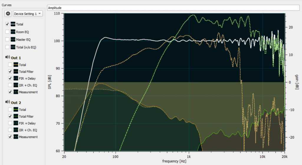 Das System Designer FIR-Filter Tool importiert die Messdaten und berechnet dann nach den Vorgaben des Anwenders die Filter. Die weiße Kurve zeigt das Resultat. Neben den FIR-Filtern können auch noch unterstützende IIR-Filter einbezogen werden (Abb. 19) (Bild: Anselm Goertz)