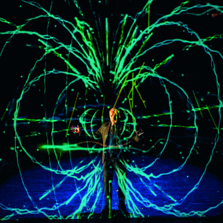 Holo-Gauze mit Aufprojektion vor einem Bühnenakteur (Bild: Gerriets)