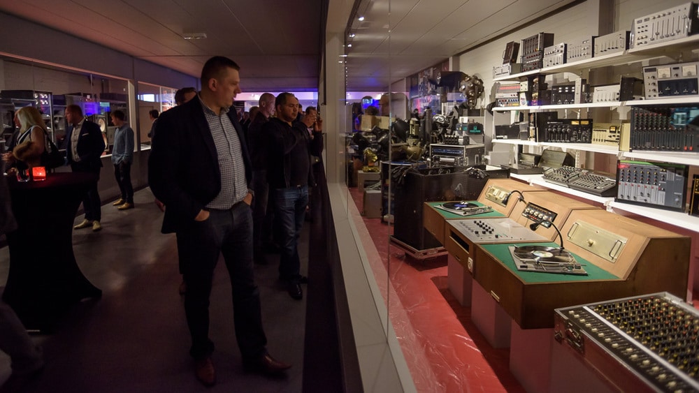 Sortiert und erfasst ist bisher der Beschallungsanteil. Neben Hardware-Exponenten (einige “Software” zeigen wir dagegen in unserer Veranstaltungstechniker T-Shirt Sammlung) aus eigener AED-Fertigung sind natürlich Muster fast aller Marken zu sehen, und wer mehr als ein paar Jahre im Geschäft ist, wird eine Fülle „Alter Bekannter“ in den Vitrinen wiederfinden, mit denen man sich einmal abgeschleppt hat. Einen großen Schwerpunkt bilden dabei Lautsprecherboxen, angefangen seit 1944. An den Wänden von Foyer/Bistro geht es dann weiter mit einer langen Parade an historischen Mischpulten. Neben einer kleinen Tendenz zu Benelux-Lautsprechermarken (und einem blinden Fleck beim deutschsprachigen Markt – gewichtige Hersteller wie d&b komplett zu ignorieren, macht eine noch bestehende Lücke offenbar) drängt sich eine weitere Erkenntnis in der Rückschau auf: Es ist verblüffend, wie ausgesprochen fortschrittlich und ihrer Zeit voraus manche Produkte schon vor Jahrzehnten waren, wenn man sie dort – umgeben von den damals marktgängigen Angeboten aus gleicher Epoche – im Vergleich sieht. Auch in der AV-Technik gilt also: Hinterher ist man immer schlauer …
