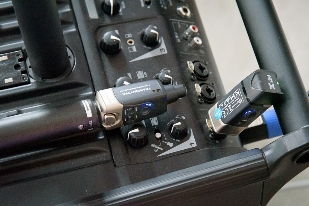 Xvive U3 Wireless to godie kleinen Sender/Empfänger sind flott an ein Mikrofon und eine kleine PA gesteckt, es ließe sich so auch ein abgesetzter Selfpowered-Lautsprecher ohne Kabelverlegen anbinden (Bild: Detlef Hoepfner)