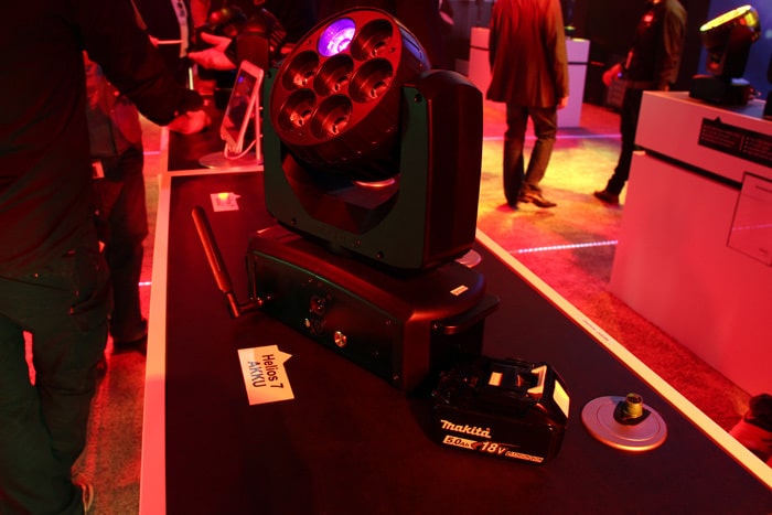 Neben vielen interessanten Neuheiten und Produkten ist vor allem der Helio 7 Akku Prototyp ein Eyecatcher. Das Wash Moving Light wird mit handelsüblichen Makita-Akkus betrieben.