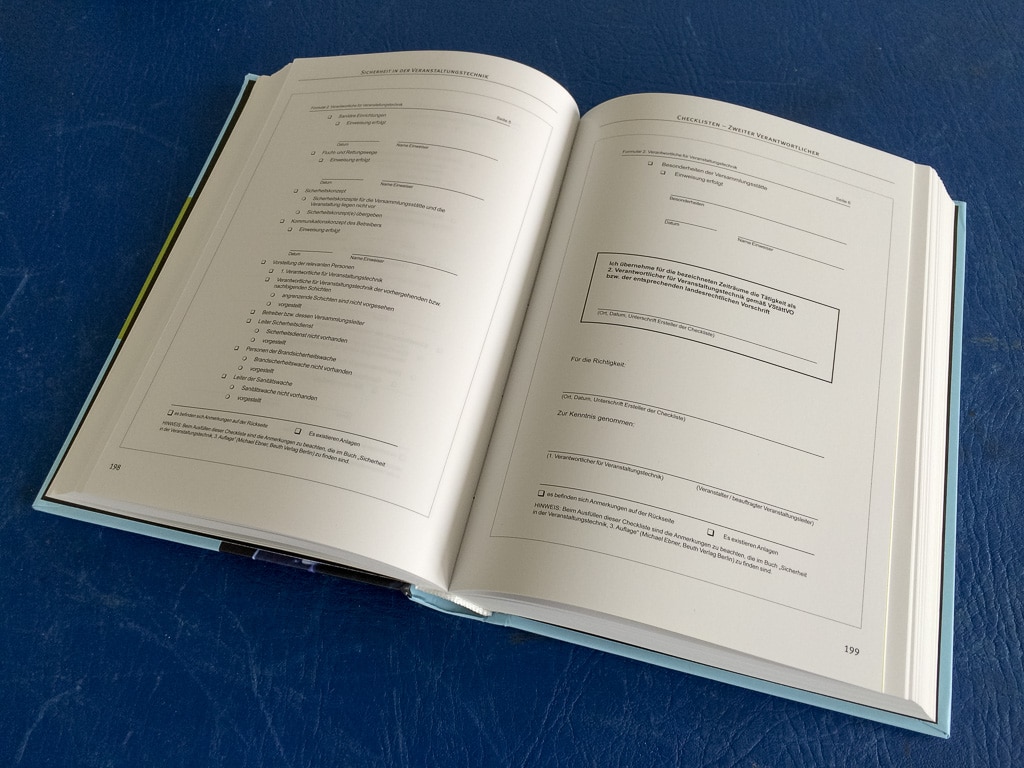 Weitere Themenbeispiele und Checklisten aus dem sehr umfangreichen Inhalt: Beschäftigte/Personal, Rigging/Lasten, Laser, Pyro, Lifte und Leitern, vorschriftsmäßige Errichtung und Betriebsbereitschaft, Arbeitsschutzgesetz, Baustellenverordnung, Betriebsvorschriften der Versammlungsstätten-Verordnung, TA Lärm, Brandverhalten von Baustoffen und Bauteilen, Anforderungen für Sicherheitsdienstleister, Ablegereife, Windlasten usw. Die Checklisten zur Risikobeurteilung und Dokumentation von Schutzmaßnahmen stehen Käufern des Buches außerdem kostenlos in einer Mediathek zum Download bereit.