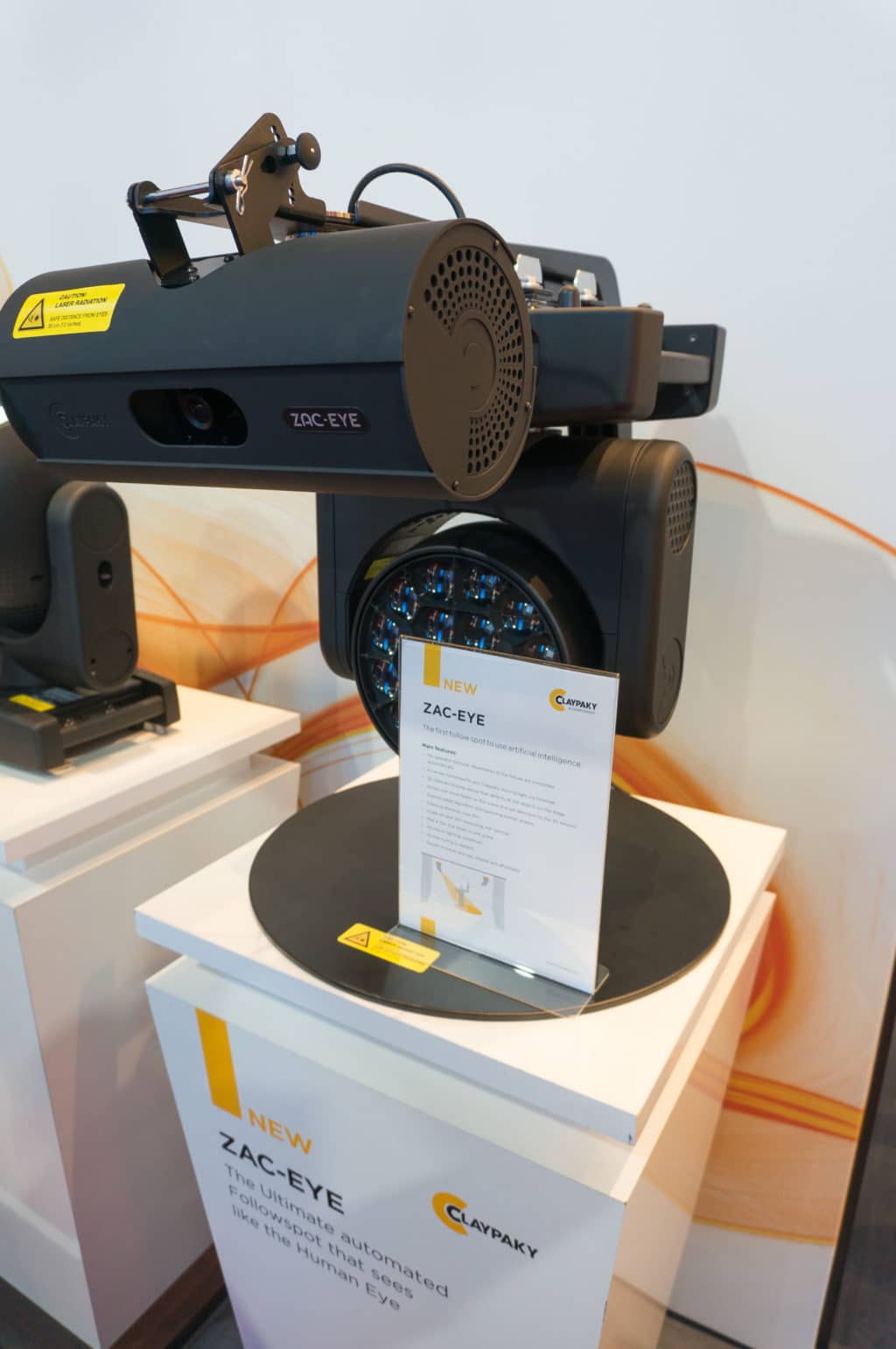 ClayPaky präsentiert in seinem Showroom auf der Prolight + Sound 2018 den “ZAC-EYE”, eine Art intelligentes Auge für Scheinwerfer. Der ZAC-EYE wird an einem beliebigen ClayPaky-Scheinwerfer montiert und mittels Ethernet verbunden – schon soll aus diesem ein Followspot werden, der einen Bereich von 60° mal 45° mittels Infrarot-Kamera scannt, sein Ziel findet und automatisch verfolgt.