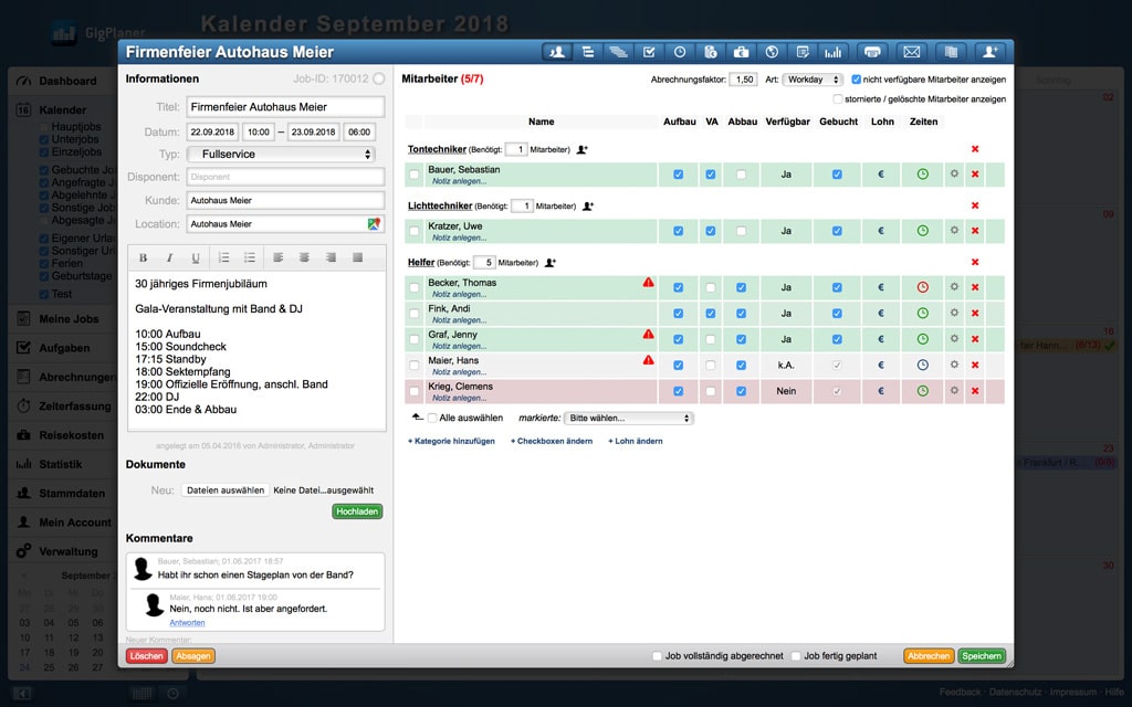 Job-ÜbersichtInnerhalb eines Jobs kann genau eingesehen werden, welche Mitarbeiter bereits angefragt, ggf. abgelehnt oder den Job angenommen haben und damit fest gebucht sind. Außerdem können Kommentare (im Bild unten links) zum derzeitigen Bearbeitungsstatus hinterlegt werden. (Bild: GigPlaner)