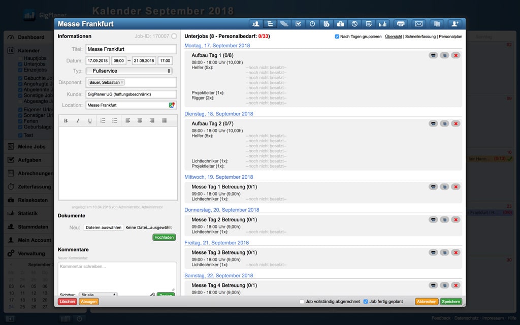 Über die Kalenderfunktion können alle Veranstaltungen, hier als Jobs bezeichnet, eingetragen werden. Nach einem Klick auf das betreffende Datum öffnet sich die Haupt-Eingabemaske. Hier werden neben dem Titel und der Art der Veranstaltung auch Kunde und Location festgelegt, die Eingabefelder greifen dabei direkt auf die eigene Kunden- und Locationdatenbank zu, so dass einfach aus den bestehenden Eingaben ausgewählt oder auch neu angelegt werden kann. Außerdem können hier zuständige Disponenten festgelegt, eine allgemeine Jobbeschreibung eingegeben sowie ergänzende Dokumente (Saalpläne, TechRider, Bühnenpläne etc.) hochgeladen werden. So haben Mitarbeiter, die dieser Veranstaltung zugeteilt werden, jederzeit Zugriff auf alle für die Veranstaltung relevanten Unterlagen. Den einzelnen Mitarbeiterprofilen können verschiedene Zugriffe erteilt werden, so dass leitende Mitarbeiter z. B. Änderungen eintragen oder mehr Jobinformationen abrufen können, als zum Beispiel eingeteilte Stagehands oder Fahrer.