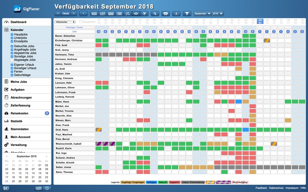 VerfügbarkeitsansichtIn verschiedenen Übersichtsfunktionen kann die generelle Verfügbarkeit aller Mitarbeiter angezeigt, oder auch nach den einzelnen Job-Kategorien gefiltert werden. (Bild: GigPlaner)