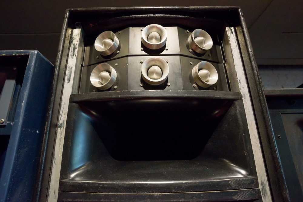 Das beliebte Martin Audio F2 war mit diversen Horn- und Tweeter-Modulen bestückbar, die sich zumindest mechanisch gut addierten. Das Modell im AED-Museum ist mit zwei Supertweeter-Arrays aus je drei JBL „Zitronenpressen“ bestückt – das war schon eine gewisse Geldanlage
