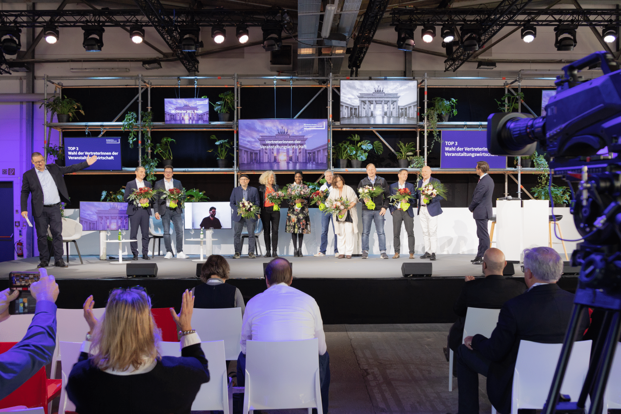 Es folgt die „Wahl der Vertreter der Veranstaltungswirtschaft“. Sieben Posten seien zu besetzen von elf zur Wahl stehenden Kandidaten. Jeder der Kandidaten stellt sich in Slots zu je 3-4 Minuten vor. Welche Aufgaben mit den Posten in Verbindung stehen, bleibt offen. Es hätte sich jeder zur Wahl stellen können, der davon wusste. Von der Bühne tönt der Wunsch, dass man bei diesen Kandidatinnen und Kandidaten gern elf Stimmen hätte und nicht nur sieben, und wird prompt erhört. Unmittelbar nach der Eröffnung der Wahl wird bekannt gegeben, dass diese technisch nicht auf sieben Stimmen eingerichtet ist, sondern nur auf eine. Es wird kurz überlegt, das Problem zu beheben, aber dann kurzerhand entschlossen, alle elf Kandidatinnen und Kandidaten zu wählen. Mit einer kurzen Rückfrage ins Publikum und verhaltenem Jubel gilt die Sache als beschlossen. Von einer Wahl kann man hier nicht sprechen.