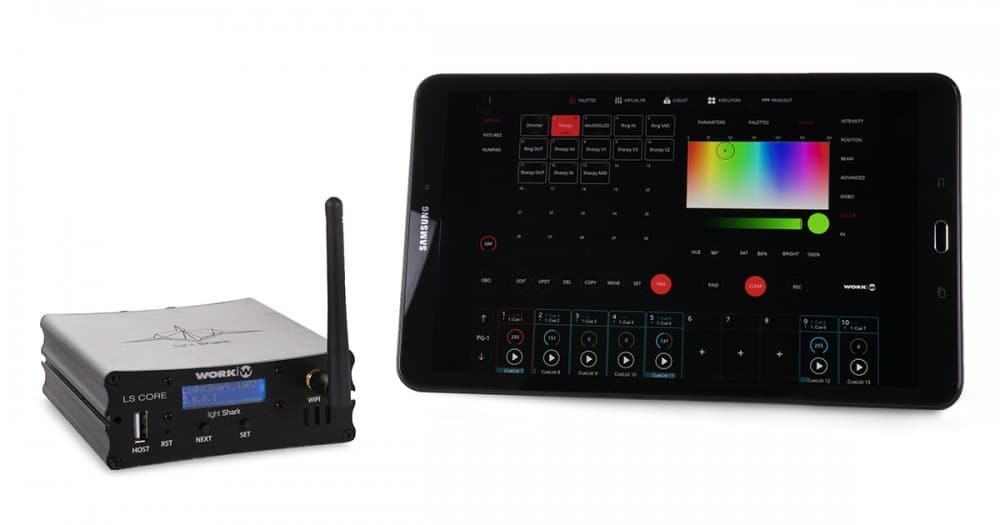Weiterer Kandidat ist die Work light Shark Serie. Auch hier bietet der Hersteller zwei Versionen an. Das LS-1 als klassische Konsole und den LS-Core als kleine Black-Box, beide mit integriertem WiFi. Novum ist hierbei, dass die Lichtsteuerung eine webbasierte Bedienoberfläche besitzt, die von jedem smarten Gerät vom Smartphone übers Tablet bis zum PC/Laptop kontrolliert werden kann. Beide Versionen können hierbei mit bis zu 3 unabhängig voneinander nutzbaren Endgeräten verbunden werden. Die Konsolenversion bietet 11 Fader wovon 10 als Playbacks fungieren, 4 Encoder und eine unabhängige DMX-Engine. Die Hardwareoberfläche der LS-1 ist dabei frei konfigurierbar.