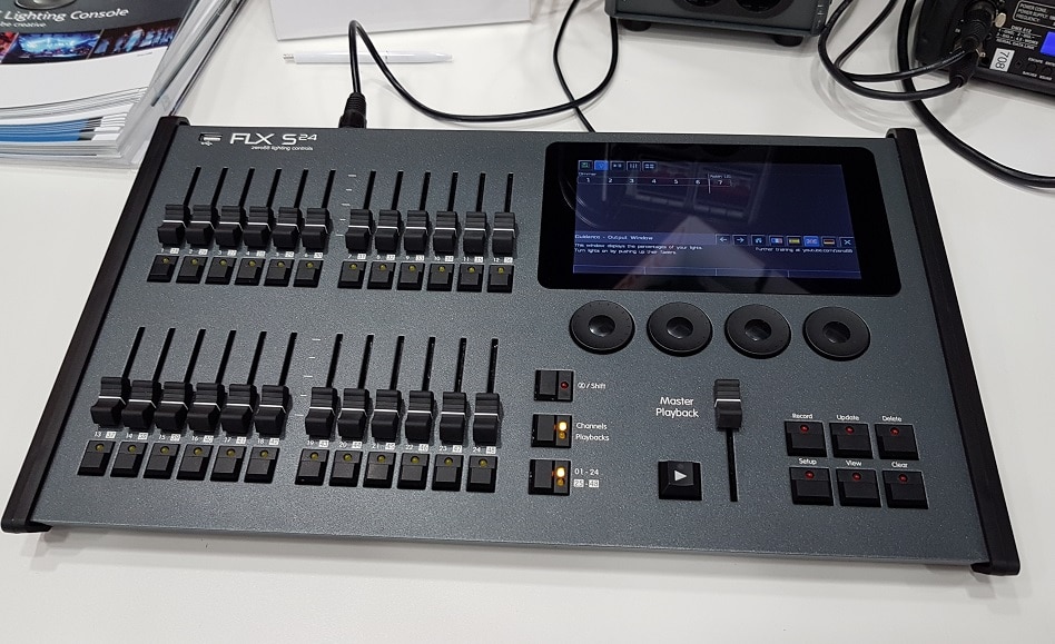 Über den Ethernet-Port senden die Konsolen auch bis zu 2 DMX-Universen per Artnet oder sACN. Die Pulte besitzen einen 7“ MultiTouchScreen und 4 Encoderräder für sehr präzise Änderungen der Lampenparameter. Die kleinere FLX S24 Version besitzt 24 Fader, die jeweils auf 2 Seiten bis zu 48 Fixture-Intensitäten oder umgeschaltet bis zu 48 Playbacks verwalten. Die Zero88 FLX S Pulte können bei Ultralite in Halle 3.0, Stand B50 getestet werden.