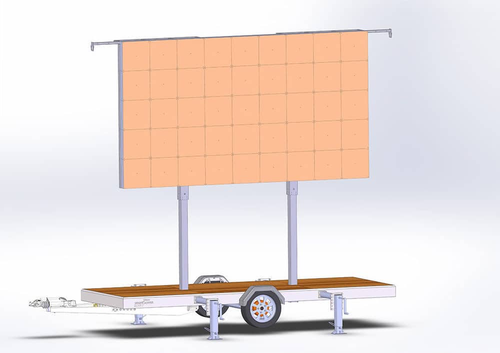 Bei diesem Trailer lag das Augenmerk der Entwickler auf einem simplen und einfachen Konzept: Kostengünstig, schnell, flexibel und effektiv. Der Screen kann nach Öffnen der Transportplane sofort mittels zweier hydraulischer Stempel bis zu einer Oberkante von 5 m ausgefahren werden, ein Standsicherheitsnachweis wird selbstverständlich mitgeliefert. Mit entsprechend stärkeren Stützen und dem für diesen Fall erforderlichen Aufpreis für ein Baubuch können auch größere Ausfahrhöhen realisiert werden.
