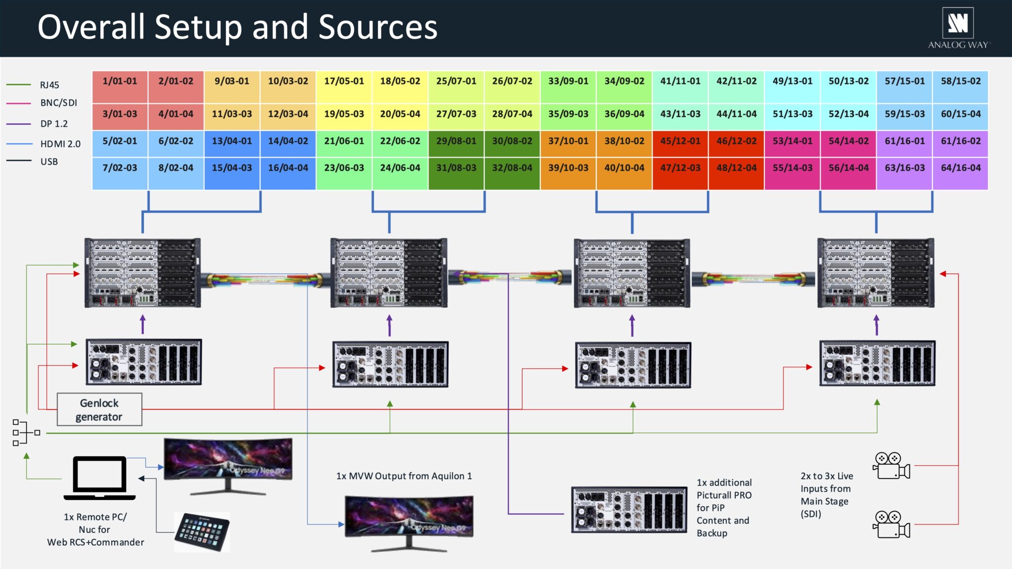 Das resultierende 16 × 4 große Bildschirm-Grid wurde von vier Aquilon C-Max, dem leistungsstärksten LivePremier-System, bespielt. Die vier Units werden per Glasfaser zu einem System verlinkt und via WebRCS gesteuert. Für den Link werden 24 × 40GbE QSFP+ Module in die Linkkarten der Aquilons gesteckt und das System zu einem Ring verbunden.