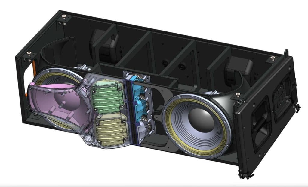Um jetzt hier im Tieftonbereich nicht hinterherzuhinken, baute man das neue 12″-Chassis 2264H: Zwei 3″-Spulen schwingen in einer Dual-Neomagnet-Anordnung, die Belastbarkeit bei niedriger Powercompression wird mit 1000 W (AES2H) angegeben. In der Leistungsklasse sind natürlich auch die Strömungsgeräusche rund um das eingebaute Chassis ein wichtiges Thema: Dazu modelliert ein komplex geformter Port die Strömungsgeschwindigkeiten so, dass am Austritt nur niedringe Nebeneffekte auftreten. Auch bereits ohne die zusätzlichen Subwoofer soll so ein satter Grundsound des Line-Arrays gewährleistet sein.