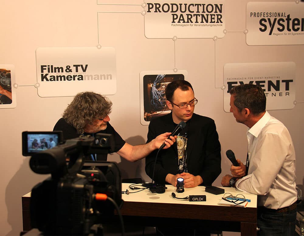 Walter Wehrhan (PRODUCTION PARTNER, l.), Landin Fusman (Gantom Lighting & Controls, m.) und Gunther Matejka (Snapshot) beim Facebook Live Video auf der Prolight + Sound. (Bild: Sylvia Koch )