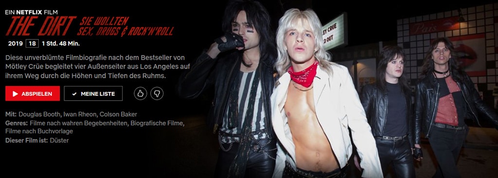 Der 108-minütige Film von Regisseur Jeff Tremaine basiert auf der 2001 erschienen Autobiografie „The Dirt“ von Nikki Sixx und Neil Strauss und ist hervorragend besetzt. Die vier Originalmusiker sind als Produzenten daran beteiligt. Inhaltlich werden Details verdreht und verkürzt, manche unliebsamen Erinnerungen (etwa die skandalträchtige Ehe von Tommy Lee mit Pamela Anderson) fielen ganz weg – ob einzelne Anekdoten tatsächlich stattgefunden haben, bleibt daher ungeklärt und umstritten. Das tut dem Unterhaltungswert des Films aber keinen Abbruch, der Backstage-Wahnsinn und ausufernde Live-Produktionen werden kurzweilig portraitiert. Geplant war die Verfilmung übrigens seit 2006 – Netflix kaufte vor zwei Jahren die Rechte, mittlerweile ist der Film (FSK 18) bei dem Streaming-Dienst zu sehen.