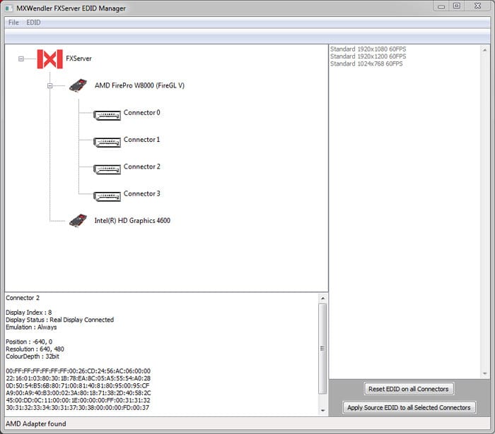 MXWendler präsentierte in Halle 9 Stand A 49 ein neues Tool, für die FX Server, den EDID Manager. Dieses Tool bietet die Möglichkeit alle angeschlossenen Grafikkarten, Monitore und Projektoren zu erfassen und anschließend die zugeordnete „EDID Position“ zu speichern. Wird ein Kabel oder ein Kabelkontakt beschädigt oder fällt ein Gerät aus, bleiben die Größen, Positionen bzw. Signalzuordnungen der anderen Geräte unbeeinflusst – der unbeliebte „rescan“ wird vermieden. Sogar ein abgerissenes Kabel beeindruckt die im EDID-Manager emulierten Geräte nicht. Mit dem neuen Tool können auch virtuelle Monitore kreiert/angelegt werden, so dass bequem ein Pre-Programming durchgeführt werden kann. Systemvoraussetzungen sind ATI Firepro Grafikkarten.