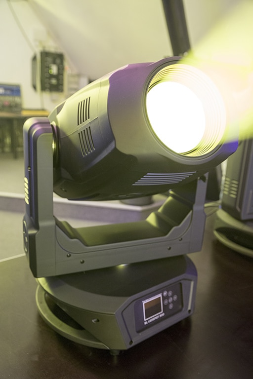 Eine weitere Neuheit war ein LEDSpot von Showline, der ebenfalls vorgestellt wurde. Showline ist eine Marke von Philips und bietet Scheinwerfer im mittleren Leistungsspektrum an. Der LEDSpot 300 ist mit einer 270 Watt starken, weißen LED ausgestattet und konkurriert so mit vergleichbaren 700 Watt-Entladern. In Zahlen ausgedrückt bedeutet das 11.500 Lumen mit einer Farbtemperatur von 6500K und einem Zoombereich von 10° bis 45°. Da der LEDSpot eine Weißlicht-LED besitzt, kommt ein CMY-Farbmischsystem zum Einsatz, welches mit einem Farbrad mit sechs festen Farben erweitert wird. Ansonsten sind auch die üblichen Funktionen für einen Spot implementiert, wie 3-fach Prisma, Frost, Iris und zwei Goboräder – eines davon rotier- und indexierbar. Die Gobos stammen aus der Vari-Lite Bibliothek. Besonders zu erwähnen ist das Blendenschiebersystem, das mit vier Blades ausgestattet ist und dazu noch um 90° gedreht werden kann. Der Showline LEDSpot 300 machte einen guten Eindruck vor Ort.