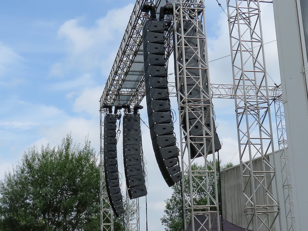Im Sauerland spielt das Wetter leider nicht immer mit, und tags zuvor sorgten heftige Regenschauer für Unmut. Wir hatten bei unserem Besuch allerdings Glück, denn irgendwelche vorhergesagten Wetterkapriolen blieben aus. Das AiRAY von Coda Audio ist ein 2 × 12“, 2 × 6“, 1,75“ Dreiwegesystem mit den Maßen 674 × 359 × 570 mm und einem „bescheidenen“ Gewicht von 38,5 kg. Zur Demonstration bestanden die Hangs aus jeweils 12 AiRAY, drei ViRAY als Nearfill, je acht dahinter geflogenen SC2-F (2 × 15“) und 16 SCP-F. Ein weiterer Vorteil von AiRAY ist, dass es sowohl klanglich als auch von der Rigging-Hardware problemlos in schon vorhandenes Coda Audio-Material einfügen lässt.