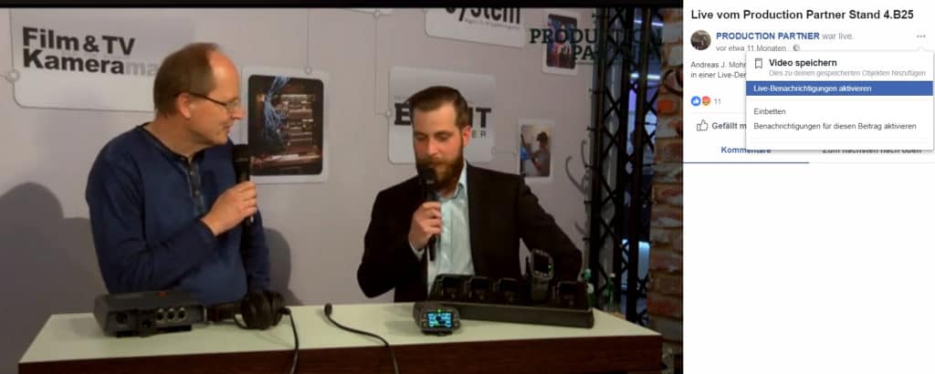 Da Facebook mittlerweile eure Benachrichtigungen stark filtert, muss die Benachrichtigungsregel für die PRODUCTION PARTNER Live-Videos in eurem Facebook-Account manuell aktiviert werden. In diesem Jahr ist diese Regel ein wenig versteckt, darum gibt es hier eine kleine Anleitung: Öffnet einfach eines unserer Live-Videos (funktioniert auch mit den Live-Videos aus 2017) und klickt oben rechts auf die drei Punkte – dort kann die Benachrichtigungsfunktion für unsere Live-Videos aktiviert werden: