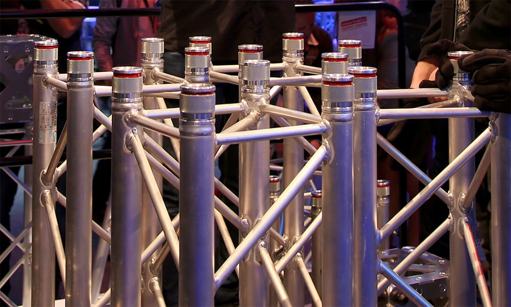 Die Weichen dafür hat der niederländische Hersteller Prolyte gestellt. Verto Truss, ein Traversensystem, bei dem die Verbindung der einzelnen Traversenelemente über eine Art Quicklock System realisiert wird. Das heißt, die Traverse wird nicht wie üblich lautstark zusammen geklopft, sondern eher sanft anmutend durch eine Vierteldrehung der Verbinder miteinander verschraubt. Ein wirklich grandioser und zukunftsweisender Ansatz. Bleibt jedoch abzuwarten, wie sp ielend das System dann noch in einander greift, wenn z. B. im Livebetrieb mal die eine oder andere Delle dazukommt. Es bleibt also spannend!