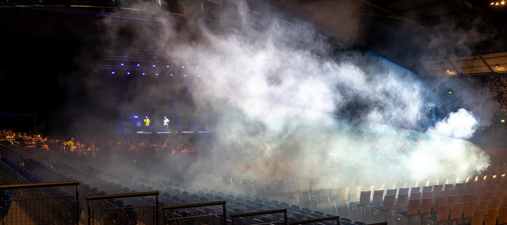 Fogger, Follow, Fan Um die Übertragung durch Aerosole zu veranschaulichen, wurde den Teilnehmern mittels Nebelmaschine die Luftbewegungen in der Halle bei unterschiedlichen Stellungen der Auswurfdüsen der Hallen-Lüftungsanlage sichtbar gemacht. (Bild: Universitätsmedizin Halle/Saale) (Bild: Arvid Rostek / Universitätsmedizin Halle/Saale)