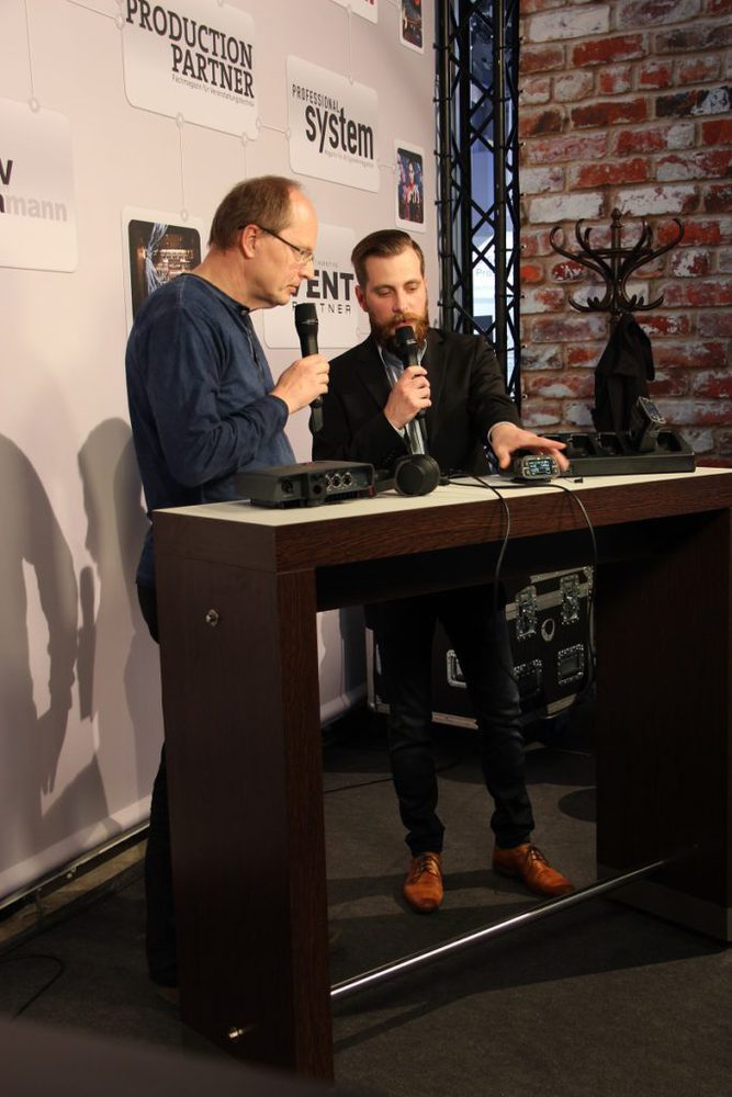PRODUCTION PARTNER-Redakteur Detlef Hoepfner und Andreas Mohnke, Sales Manager bei Riedel Communications, im Interview auf unserem Videostand der Prolight + Sound 2017! (Bild: Sylvia Koch)