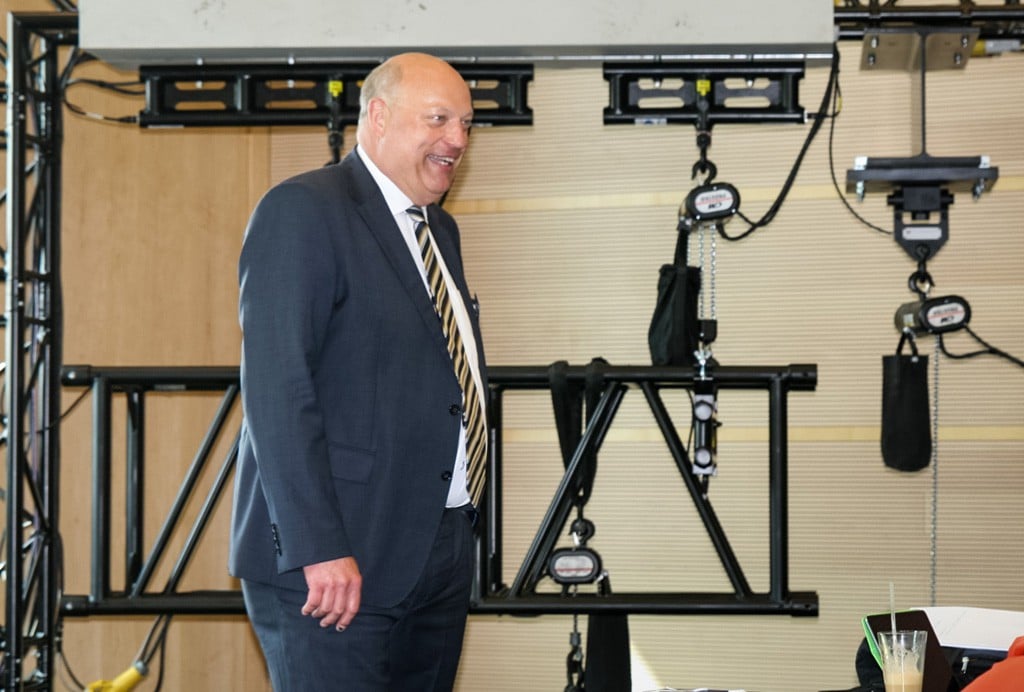 Heiner Betz als wiedergewählter Vorsitzender der Gruppe AG IV (Technik), im Hintergrund ein Demonstrationsaufbau der Firma Rigging Service zur Lastmessung (Bild: Herbert Bernstädt)