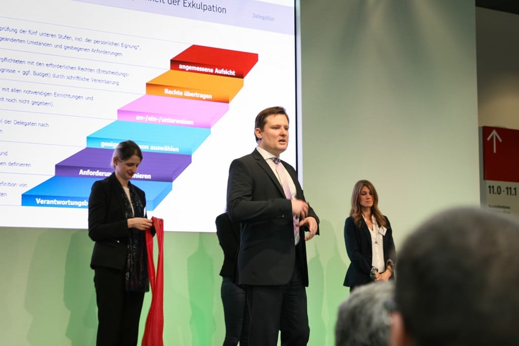 Aus großer Kraft folgt große Verantwortung – im übertragenen Sinn bedeutet dies: Man kann in Führungspositionen nicht nur viel bewirken, sondern übernimmt auch die Verantwortung. Naheliegend, dass Rechtsanwalt Martin Leber gleich darauf hinwies, dass Verantwortung nicht gleich mit Haftung einhergeht. Auch wenn man glaubt, die Verantwortung an eine folgende Stelle (wie z. B. einen Unternehmer) weiterdelegiert zu haben, hat man noch lange nicht „den Hals aus der Schlinge“: Man muss sich auch vergewissern, ob der Auftragnehmer in der Lage ist, die delegierte Aufgabe richtig umzusetzen und sich durch Kontrolle vergewissern, dass dies auch in der angemessenen Weise erfolgt. Aber was ist, wenn dieser Unternehmer weiter an Subunternehmer delegiert? Das Fazit: Als Betreiber muss man auch die weitere Kette der Aufgabenweitergabe verfolgen, um der Sorgfaltspflicht Genüge zu tun, denn der ursprüngliche Träger der Pflichten bleibt immer in einer Restverantwortung. Hat er Anhaltspunkte dafür, dass der Subunternehmer nachlässig arbeitet, muss er eingreifen. Ein Beispiel aus dem Begleitbuch, das kostenfrei auf dem Vortrag verteilt wurde, zeigt sehr anschaulich die Zusammenhänge der Weisungs- und Kommunikations-Strukturen: „So entschied das LG Nürnberg-Fürth, dass ein Veranstalter für Hörschäden von Besuchern, die jene aufgrund zu lauter Beschallung erleiden, selbst dann haftet, wenn nicht der Veranstalter, sondern die Tontechniker des Künstlers für die Beschallung zuständig waren. Zur Begründung wurde ausgeführt, dass der Veranstalter aufgrund seiner Verkehrssicherungspflicht die Künstler wie auch deren Tontechniker zu überwachen habe und die Überwachungspflicht des Tontechnikers nicht auf diesen selbst als Lärmverursacher abgewälzt werden dürfte.“