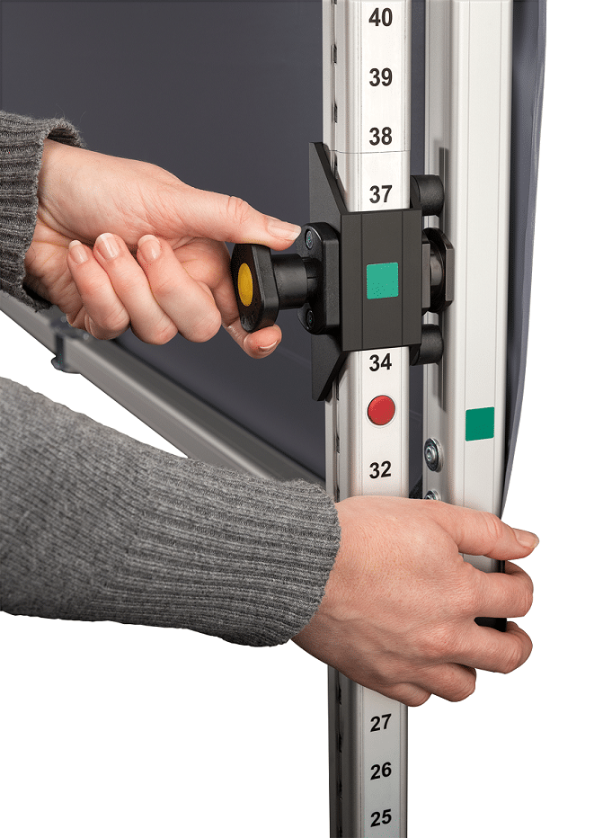 Das neue Zubehörteil kann ganz einfach mit den bestehenden AV Stumpfl Leinwandsystemen kombiniert werden und macht es möglich, dass selbst nur eine einzige Person ganz einfach die Höhe einer mobilen Projektionswand verstellen kann.
