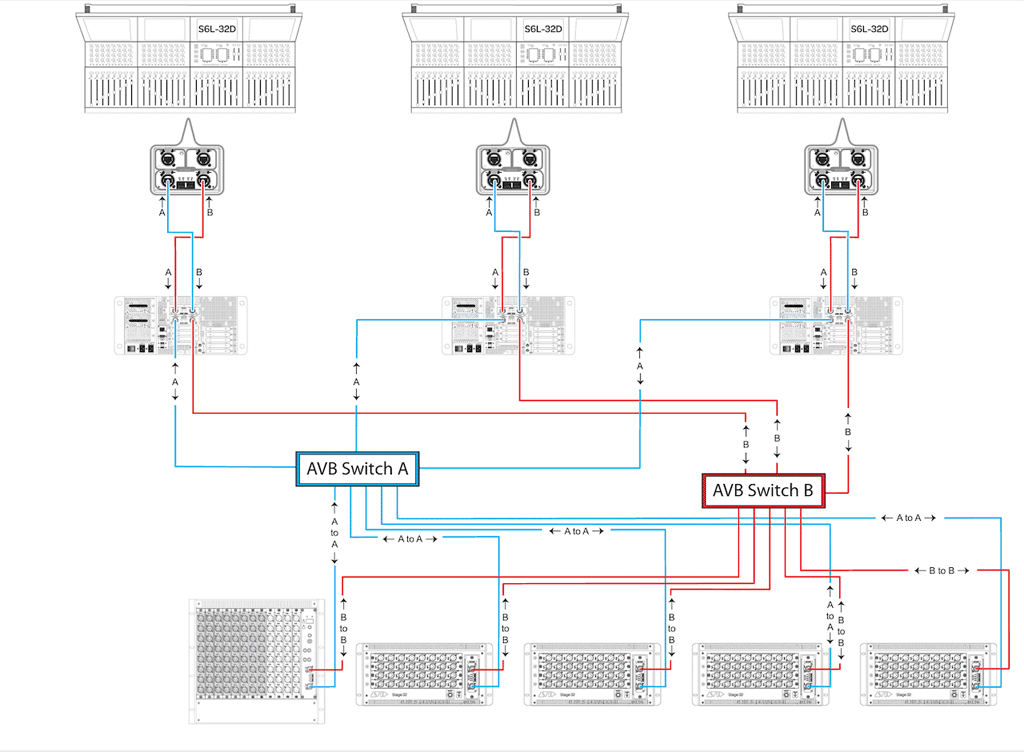 FOH, Monitor und Broadcast – mit VENUE 7 können sich bis zu drei Systeme dieselben Stage-Racks teilen. Die Kompensation der Vorverstärkung über alle drei Systeme hinweg erfolgt automatisch durch die Avid True Gain-Technologie. Sobald die Systeme in einer redundanten AVB-Sternkonfiguration verbunden sind, erkennen sich die einzelnen Systeme automatisch und aktivieren die entsprechende Gain-Kompensation.