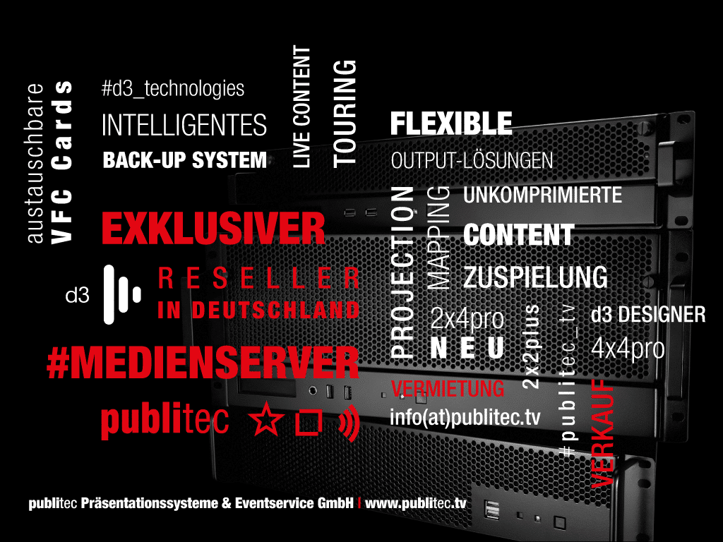 Aufwändige Fassaden-Mappings oder beeindruckende Panorama-Projektionen – für die Medienserver von d3 Technologies kein Problem. Auf www.publitec.tv/d3-medienserver präsentieren wir weitere Vorteile der d3-Maschinen. Aber schauen Sie selbst, denn manchmal sagen Bilder mehr als Worte …