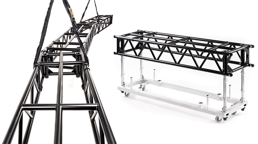 Die neue Containertraverse kommt mit vier neuen Features: Mit den Rotable Forks lassen sich ohne zusätzliche Komponenten horizontale und vertikale Kreise bilden. Die Teleskopfunktion der Adjustable Legs verkürzt die Montage/Demontage. Der Folding Dolly ist nun klapp- und stapelbar und ermöglicht optimale Zwischenlagerung während der Show. Mit den stoßdämpfenden Rollen (Softshock Wheels) von Blickle werden Truss und Material leicht und sicher transportiert.