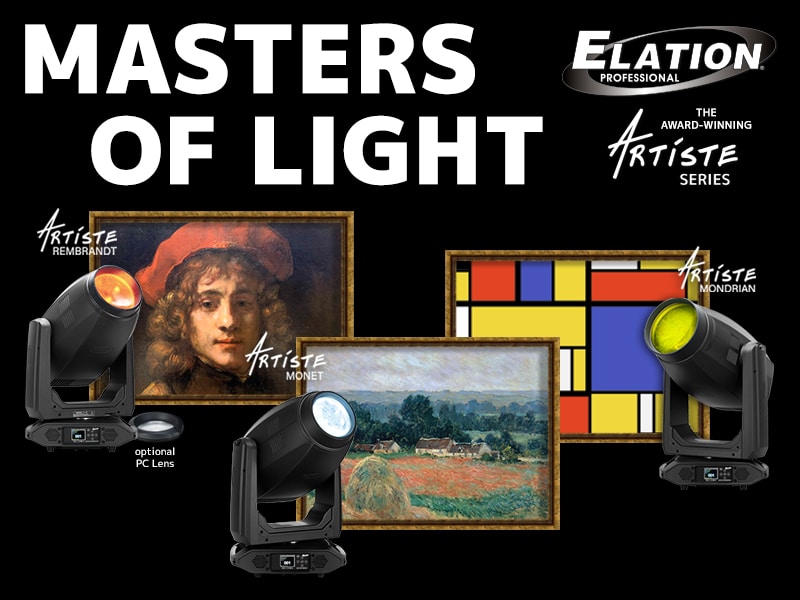 Der Artiste Rembrandt™ (Wash/Beam), der Artiste Mondrian™ (Beam FX) und der Artiste Monet™ (Profile) von Elation verfügen über modernste, sich perfekt ergänzende Eigenschaften und bilden so eine kreative Familie von kombinierbaren, leistungsstarken LED-Movinglights.