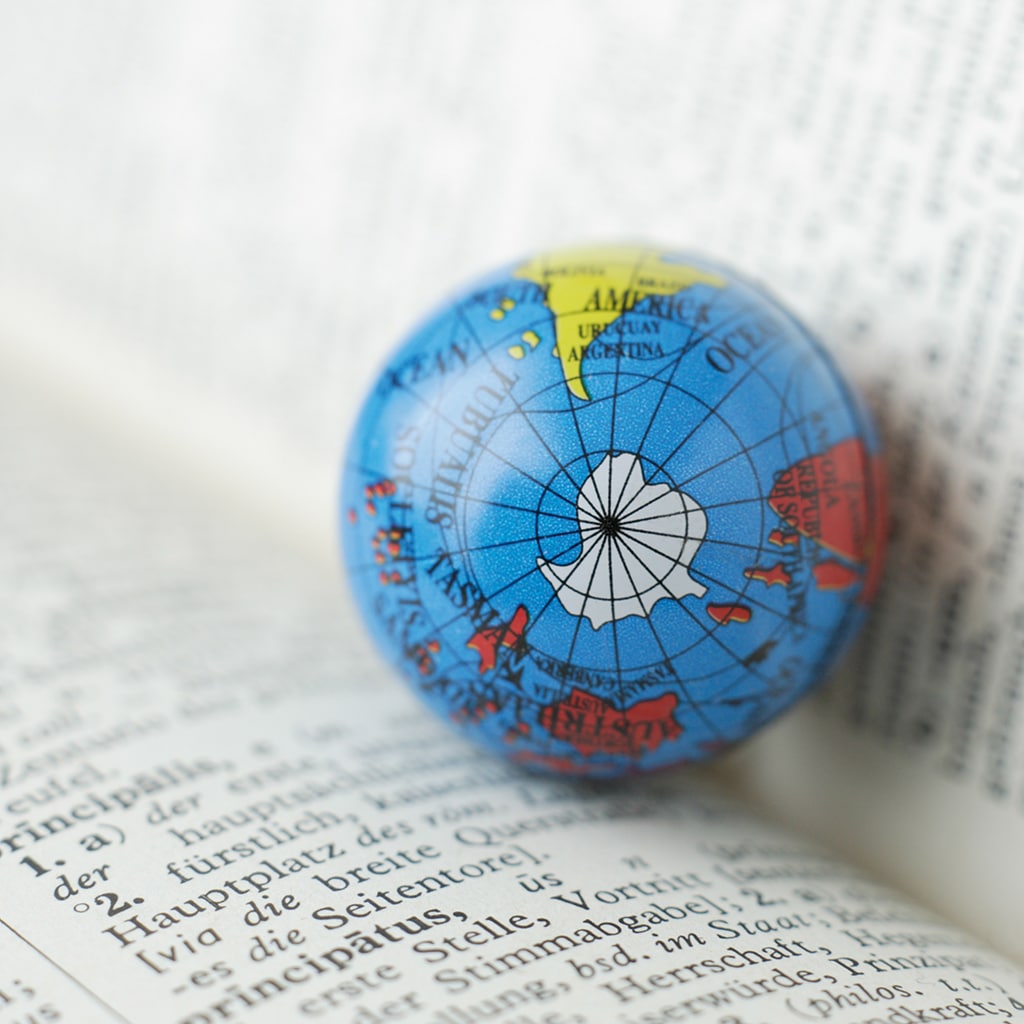 Deutschland, Nahaufnahme der Erdkugel auf offenen Wörterbuch