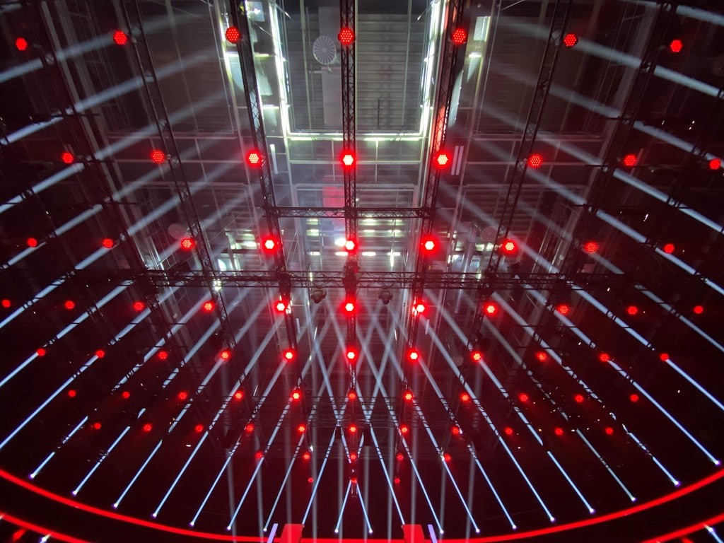 Das Studio selbst besteht aus einer recht großzügigen Spielfläche, die durch lange LED-Banderolen und Scheinwerfer eingefasst wird. Über der Spielfläche hängt eine Lichtmatrix aus 141 GLP Impression X4 Movinglights.